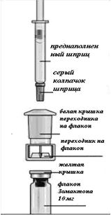 Каждый новый флакон с Зомактоном требует использование нового адаптера. Адаптер необходим для присоединения флакона с головкой инъектора.