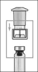 - После того как набрана необходимая доза, переверните инъектор головкой вниз, при этом флакон необходимо поставить на плоскую поверхность. Извлеките инъектор из флаконного адаптера.